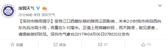 深圳新闻网讯 深圳市气象台2017年04月06日07时20分发布,深圳未来2小时深圳将出现小雨,记得带雨具。