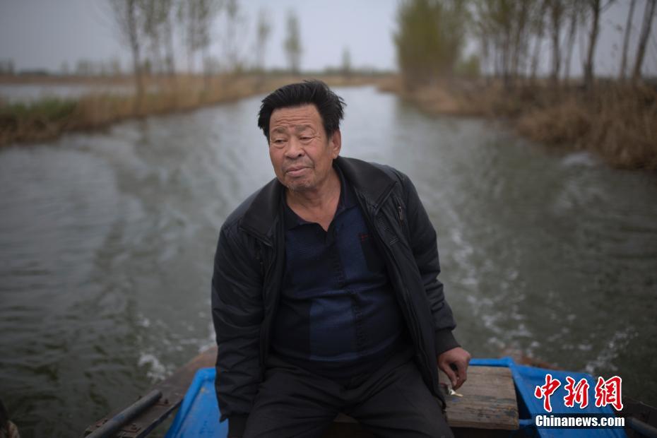 4月4日,白洋淀岸边的河北省安新县留通村村民杜锁良划着自己的小船穿行在白洋淀里。60岁的杜锁良从6岁起就跟着家人开始了船上生活。清明几天,他已经连续接待了几波北京天津来的客人。中新社记者 刘关关 摄