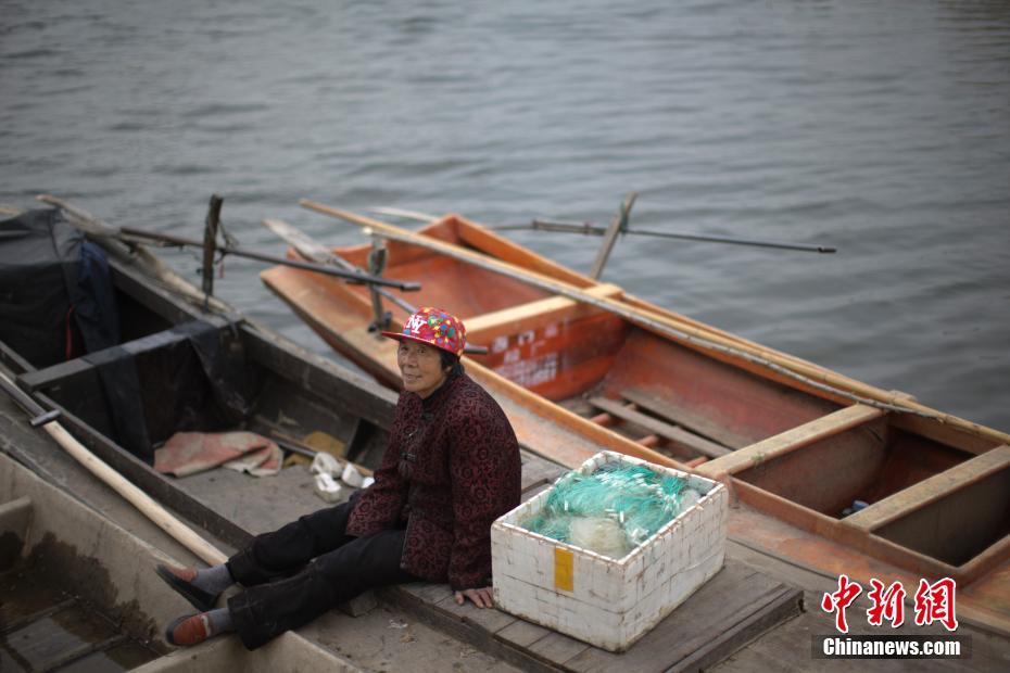 4月4日,白洋淀岸边的河北省保定市安新县留通村,69岁的村民李福禄坐在自家的船上。除非天气不好,每天她都会在白洋淀劳作。中新社记者 刘关关 摄