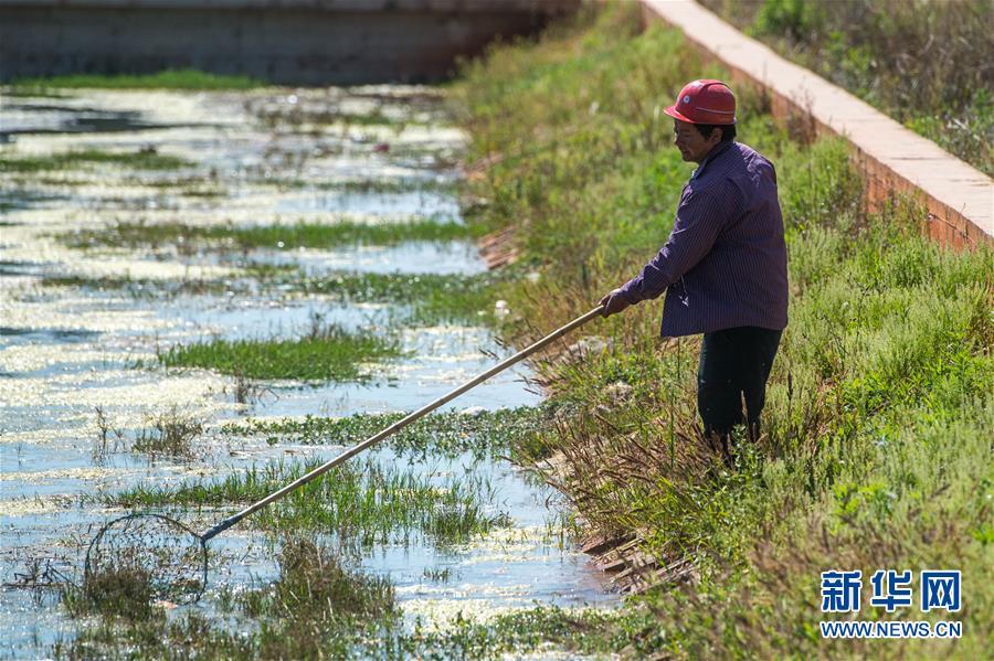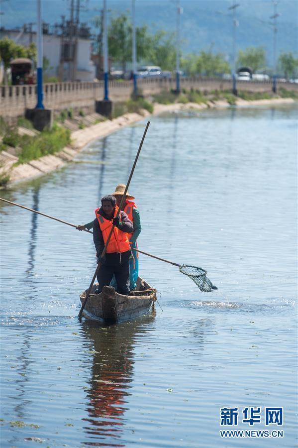 4月6日,在云南省玉溪市通海县杞麓湖的主要入湖河流红旗河,两名工作人员在打捞水生植物残体。