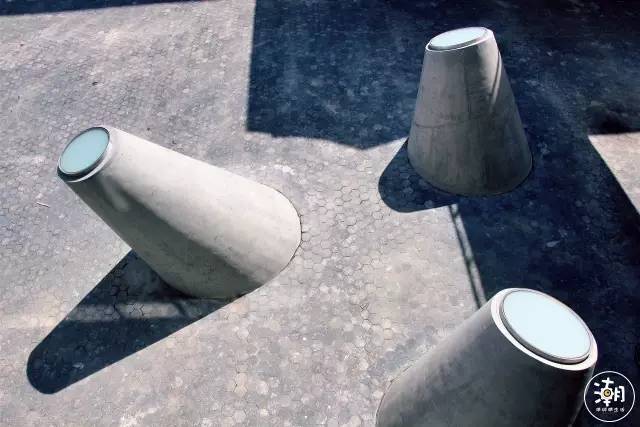 在大楼南面的入口广场,有三个形态各异的圆锥形体量,别看顶部小,它们可是在为地下的特殊实验水池提供采光呢~