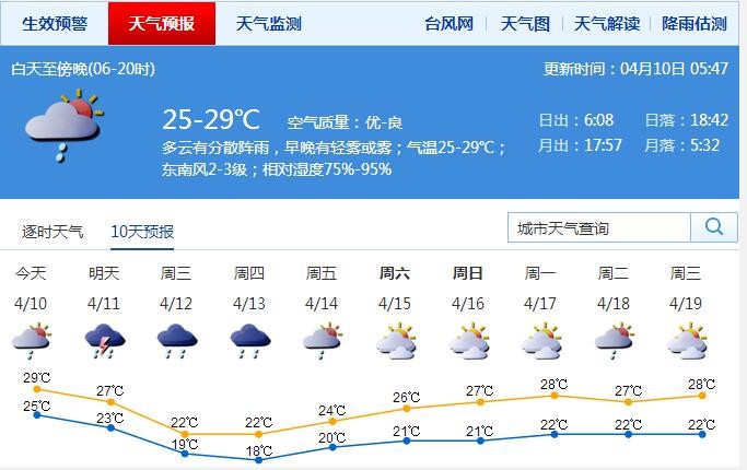 新闻提要 10日多云,早晚有轻雾或雾,偶有分散阵雨,气温23-29℃;11日早晨雾气明显,白天受冷空气影响,转雷雨伴7级左右短时大风,局地雨量可达大雨;12-13日有频密的间歇性阵雨,局地雨量可达大雨或以上; 14日降雨减弱;15日转多云