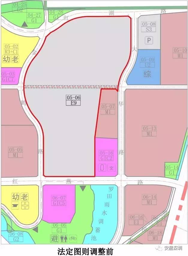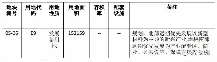 [松岗燕川地区]法定图则 05-06地块位于燕罗街道燕川社区红燕路北侧,规划用地性质为发展备用地,用地面积152159平方米。容积率:无。备注“规划,北部远期优先发展以新型材料为主导的新兴产业, 南部远期优先发展为产业配套区、商业、公共设施、保障住房等项目”。现状为空地。