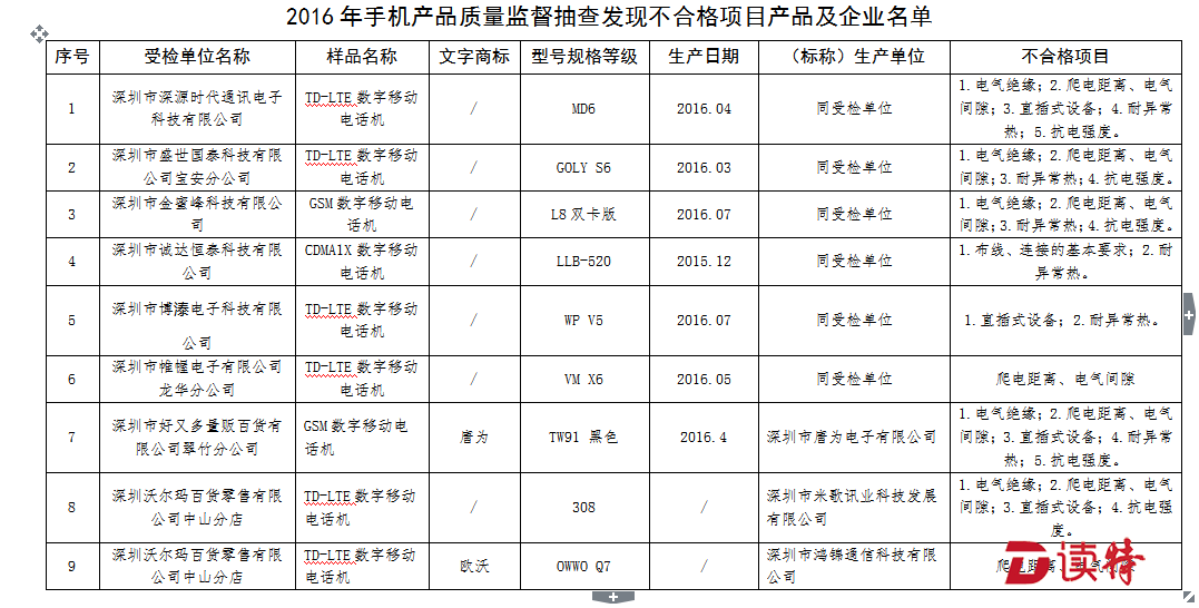 2016年手机产品质量监督抽查发现不合格项目产品及企业名单