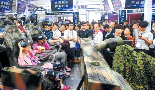 第五届电博会吸引了来自全球超过1700家行业领军企业参展,图为VR特效影院吸引市民眼球。 深圳特区报记者 吴铠峰 摄