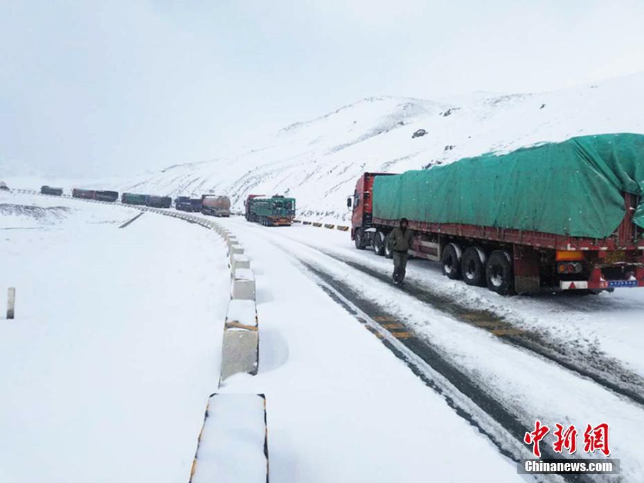 受冷空气影响,甘肃酒泉境内国道215线当金山路段普降大雪,截至4月10日凌晨,部分路段积雪厚度达20多厘米,致道路结冰,目前仍有200余辆大型车辆被困。高宏善 摄