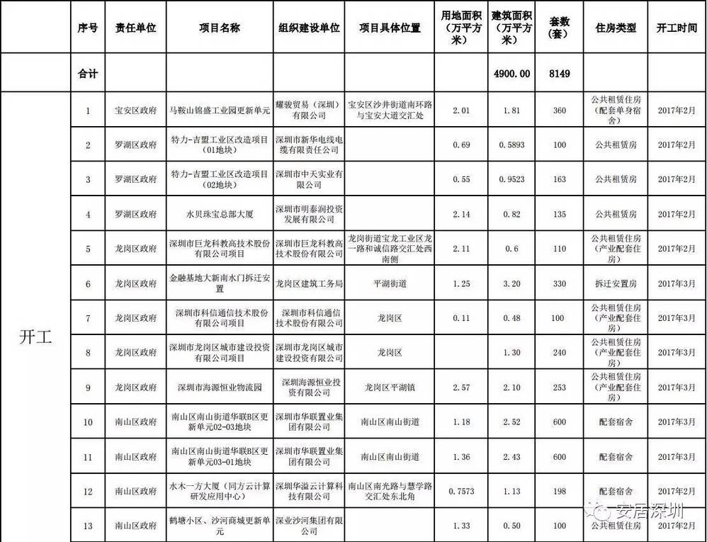 『深圳市2017年一季度保障性安居工程已开工、筹集项目表 』