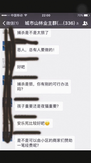 4月8日,一个名为“猫语者”的微信公众号,发表了一篇题为《城市山林的某些业主,请收起你们的杀心!》的文章,用多张截图,展示了城市山林小区内,一个300多人的业主群里,几名业主讨论如何捕杀小区内流浪猫的讨论内容。除了讨论杀猫一事,还有业主表示愿意出资2000元用于杀猫费用,以及购买毒鼠药用于杀猫,甚至有讨论吃猫一事,“既然是无主夜(应为野,编者注)猫,人人有权利捕杀之。为了自己和家人健康”,一位业主如是说。