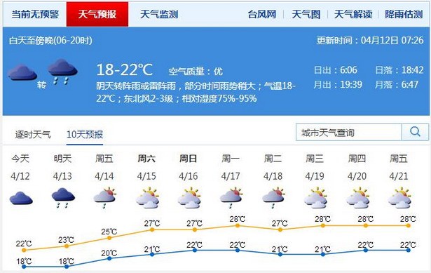 预计今日阴天有雷阵雨,局地大雨;气温下降,20℃-24℃;东北风3级;空气相对湿度75%-95%。13日降雨减弱,仍有阵雨。14日阵雨转多云,气温回升。展望15-16日多云为主,天气暖湿。17日再转阵雨天气。(记者罗洁琳)