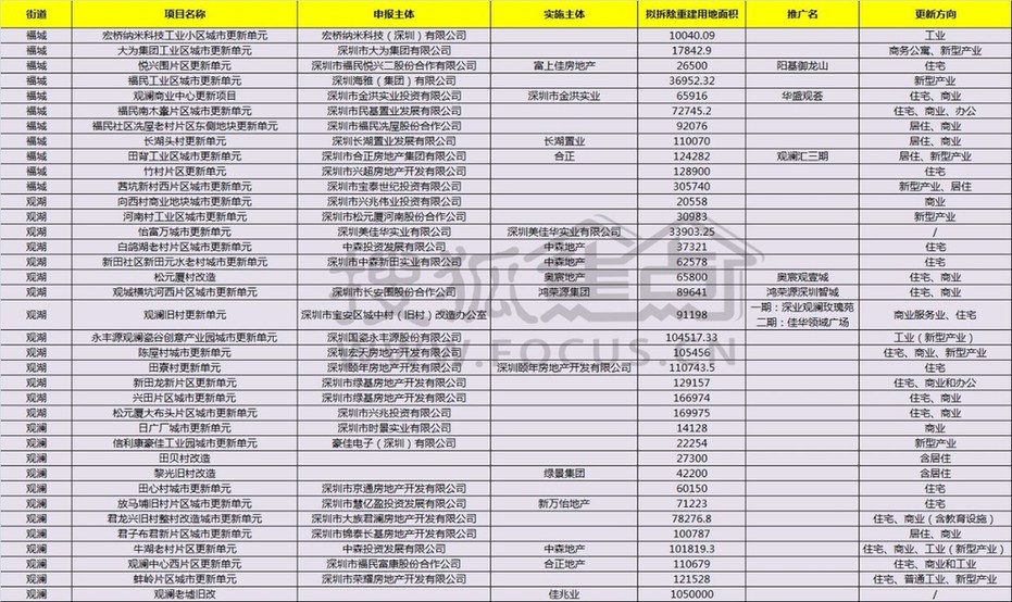 据搜狐焦点网不完全统计,目前观澜片区(包括观澜、观湖及福城)三个街道有约37个旧改项目立项改造,拆除重建建设用地总面积约401万平方米,占龙华区旧改项目约3成其中,涉居住功能的项目超20个。