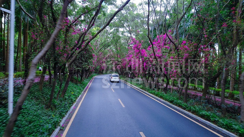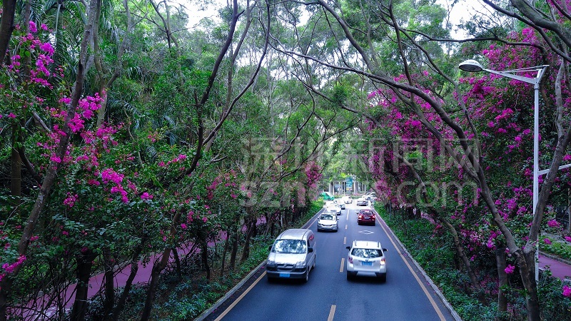 首先我们来科普一下勒杜鹃这个植物。勒杜鹃又名三角花,学名叫宝巾。勒杜鹃的叶子是呈心型的,它的观赏部位是苞片,其苞片似叶,花于苞片中间,故称之“叶子花”。它的花是由三根火柴头般大小的花苞聚在萼片的中脉上,花柱是深红色的。它的花是淡黄色的,比黄豆还要小,小得使人误将它的萼片看成了它“本尊”。而这勒杜鹃不在深圳的荒郊野外,也不在需要收费的旅游景点,它就在侨城北地铁站出来的香山中街。 这条街的勒杜鹃到底长成什么样子呢?我们一起来看一波高清航拍图。