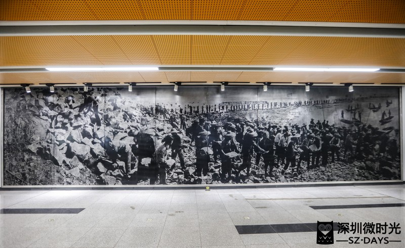 宝安站的艺术墙,还原了一张拍摄于1973年宝安西乡公社翻身大队农业学大寨围海造田的老照片。
