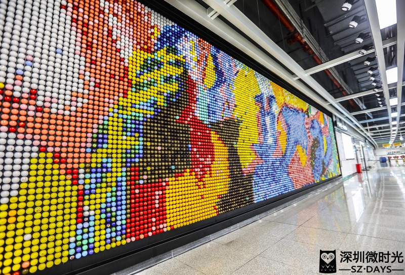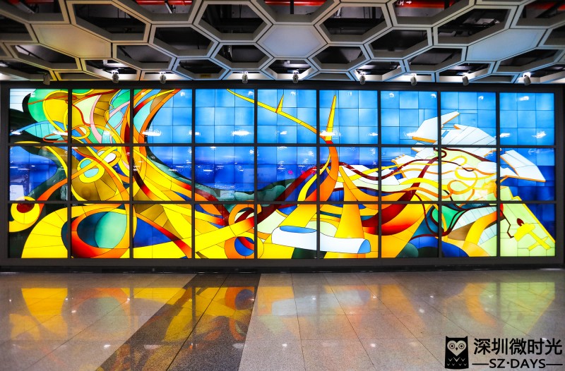 这面墙上的镶嵌玻璃画,饱满浓郁的色彩很抓人眼球,但这些蜿蜒交错的线条实在抽象,第一眼瞅上去根本不知道所画为何物。再后退两步看,竟认出了深圳湾。而实际上,这是一幅于机场站相呼应的抽象版深圳鸟瞰图。