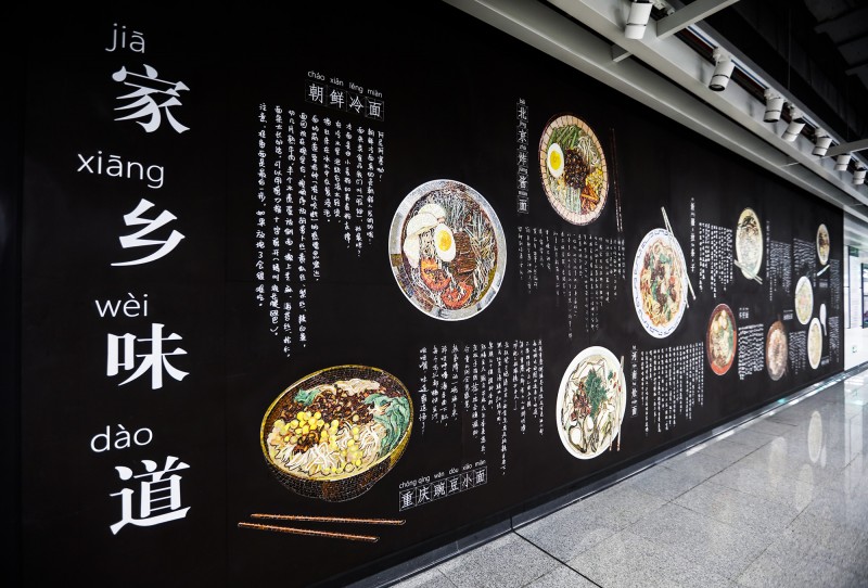 这面墙,专撩人食欲:朝鲜冷面,重庆豌豆小面,北京炸酱面,河南烩面,新疆拉条子,车仔面,杭州片儿川,油泼扯面,兰州牛肉面,武汉热干面,鲜虾云吞面,用嘴念出来敢情成一贯口了。这天南地北的11碗特色面条被一一搬上了墙,每一碗都是用小块不规则的马赛克玻璃贴出来的,很是逼真。再配上旁边的解说,恨不能马上一样来一碗。
