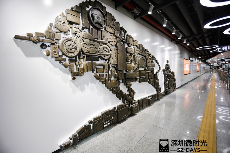 有着“中国电子第一街”之称的华强北,可算是深圳制造最响当当的牛气代表了。在华强北站点,这位名为“深圳制造”的地铁墙上,一只牛锐气冲天,卯足劲头欲冲出墙面,浑身铜质在行人的触摸下,越发亮锃锃。牛身由一块块深圳制造的物件形状拼接而成,上面刻着对应的公司大牛,腾讯,比亚迪,康佳,华为......