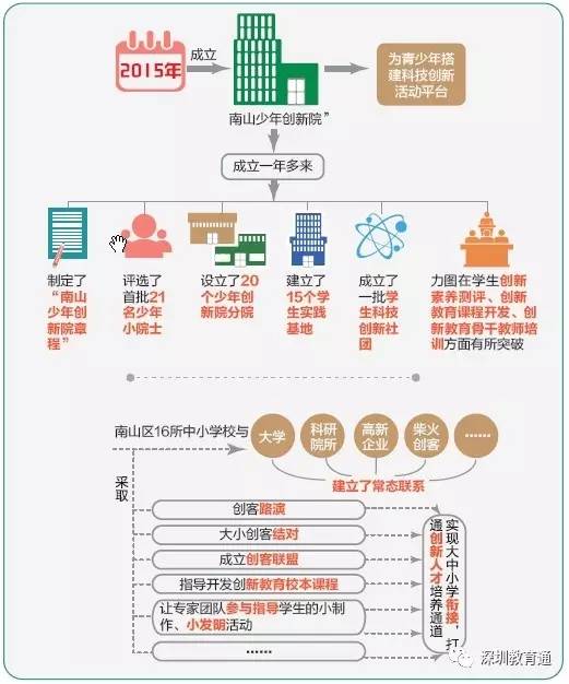 据了解,该报告详细梳理了近年来南山推出的一系列教育改革举措。如,大、中、小学衔接打通学生创新能力培养,加强学校之间、校企之间、学校与科研机构之间合作以及中外合作等多种联合培养方式,形成体系开放、机制灵活、渠道互通、选择多样的人才培养体制;以“少年创新院”为载体,大力开展创新教育,2016 年该区25 名学生获得中国少年科学院“小院士”称号,小院士及其科技创新作品接连走进第17 届、18 届高交会。
