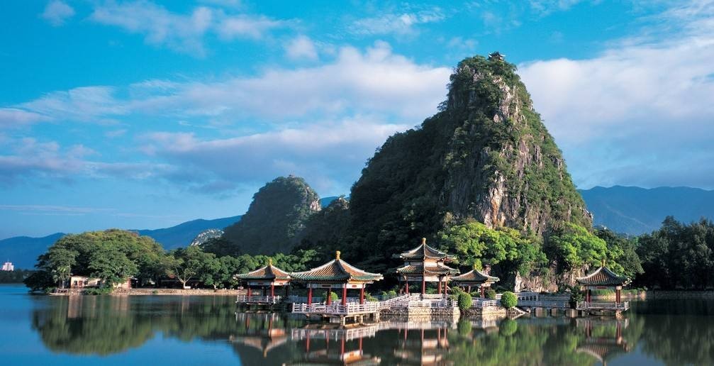 七星岩景区以岩峰、湖泊、溶岩地貌为主要景观。七座岩山排列状如天上北斗,镶嵌在碧波荡漾约9000亩的湖面上,岩峰挺秀,湖水清澈,绰约多姿,兼西湖之秀,阳朔之美。七星岩被誉为“ 岭南第一奇观”、“人间仙境”。