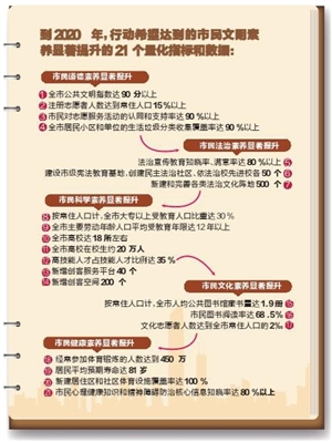 《纲要》的另一重要突破和创新亮点在于:为了让人们对市民的文明素养有更具体、更直观的感受,围绕2020年市民所要达到的文明素养水平以及工作要达到的状态,《纲要》提出了21个量化指标和数据,比如注册志愿者人数达到常住人口15%以上,市民图书阅读率达68.5%,居民平均预期寿命达81岁等,力求对现代文明市民进行更加精准的画像。