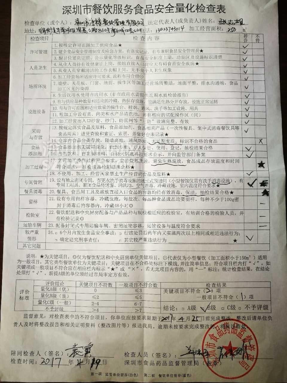 检查结果:未发现关键性和一般性的问题,维持餐饮量化等级B级,其中探鱼(南联摩尔城店)已经达到A级标准,可以进入A级申请程序。