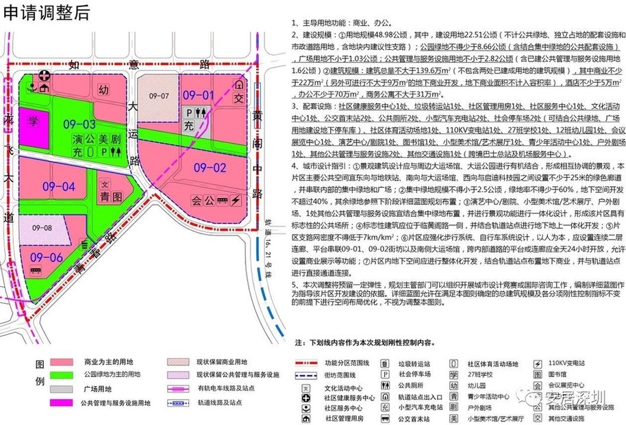 本次结合《深圳市城市规划标准与准则》的要求,拟对[大运新城地区]法定图则09-01-01、09-01-02、09-04-01、09-04-02地块的规划设计调整如下: