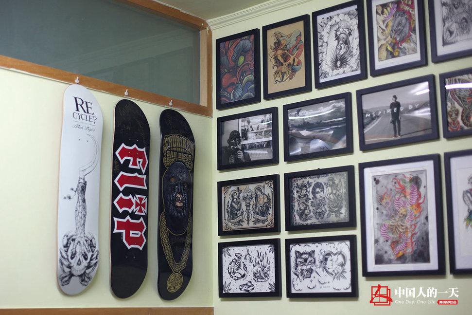 甲板的屋子里挂着炫酷的滑板和一些纹身画稿,它们是这群年轻人的精神图腾。反传统,反流行,反规则,这是街头文化的三大信条。还好,深圳是一个包容的城市,没有人会对年轻人的特立独行指指点点。