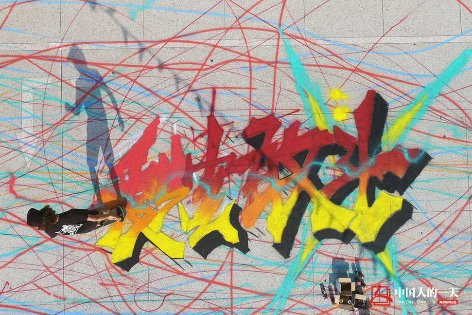 一下午的滑行与劳作,用无人机在空中俯瞰,涂鸦的轮廓才初现雏形。部分字体仍采用在滑板上手绘喷涂的方式表现,为了整体效果,滑板涂鸦依然存在一些局限。