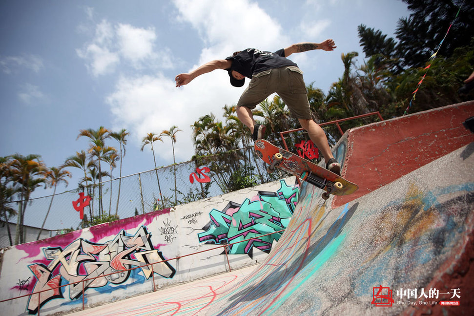 完成大作之后,甲板在现场玩了起来。他喜爱这种跃起俯冲的感觉,“能感受得到自由和释放”。不管是滑板,涂鸦,亦或是纹身,都是表达自己的一种方式。