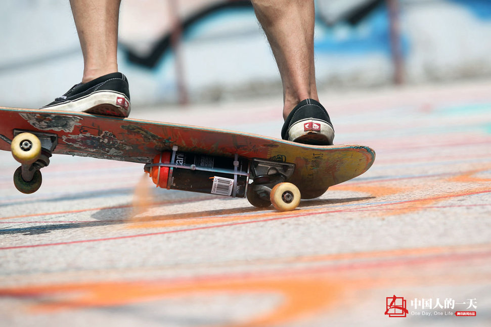 按照之前画的线稿,甲板在地上不断调整滑行路线,寻找感觉。掌控滑板、保持平衡对常人已是难事,还要靠滑板画出繁复的线条与图案,这更需要滑板者付出十二万分的努力。