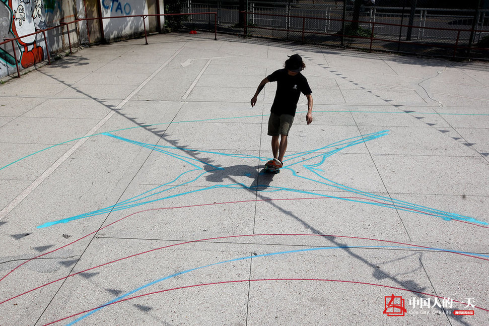 甲板独立画出背景最重要的元素:四芒星。当手中的绘画笔变成了滑板,难度就陡增了很多倍。转向、滑行、前进、后退,每一个线条都有讲究。滑冰场面积比想象中更大,这意味着如果要画出效果,就需要更大的尺寸。炎热夏天,这对滑板者的体力与意志力都是一种挑战。