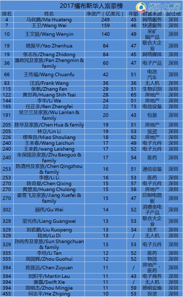 另据福布斯中文网数据:2017年共有486位华人富豪上榜,较2015年增加116位。华人富豪主要分布在中国大陆、香港及台湾地区,分别有335位、67位、30位。根据腾讯大粤网编辑统计,除了榜单上一位从事零售业难以确定其居住地的富豪,广东地区共有70位富豪上榜:广州15位、深圳36位、东莞和佛山5位、汕头4位,中山、潮州、普宁、云浮、珠海各1位。(图为深圳上榜富豪。大粤网制图)