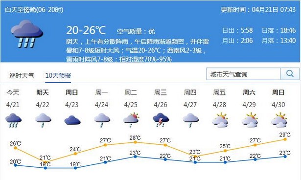 据气象局预报,21日受冷空气和切变线的共同影响,深圳有中到大雨,并伴有雷暴、短时强降水和7-8级短时大风,强天气主要出现在午后至傍晚时段,夜间雨势减弱,北风清劲,沿海和高地的阵风6-7级,气温下降;22日天气显著转凉,早晨最低气温将降至18-19℃;23-25日多云间阴天为主,间中有分散阵雨;26日受冷空气影响,深圳再转雷雨天气。