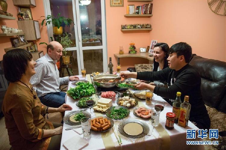 刘贵宾(右一)和土生土长的白俄罗斯妻子纳斯佳(右二),及她的父母一起吃火锅(4月13日摄)。自从有了来自中国珲春的女婿,纳斯佳的父母爱上了火锅,他们以前怕辣,现在也习惯了从鸳鸯锅的红汤里捞几块肉吃。