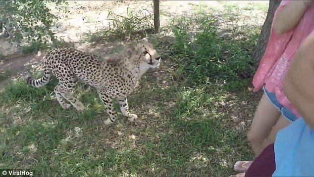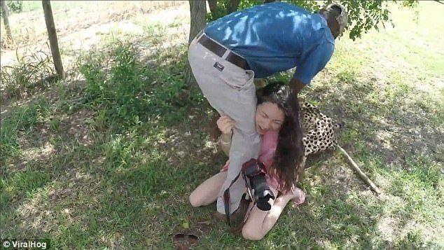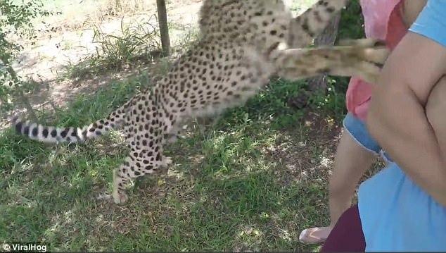 女学生吓得大声尖叫,把自己蜷缩在地上。图为猎豹扑向女孩瞬间。