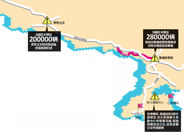 高峰期预计在4月30日,车辆达到一定数量将启动交通管制引导绕行