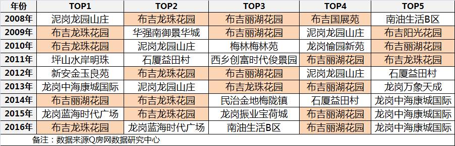 2008-2016年深圳二手房热销楼盘TOP5排行榜