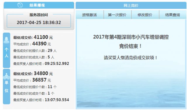4月25日,深圳举行今年第4期普通小汽车增量指标竞价,其中个人指标最低成交价为41000元,比上一期增加1000元。