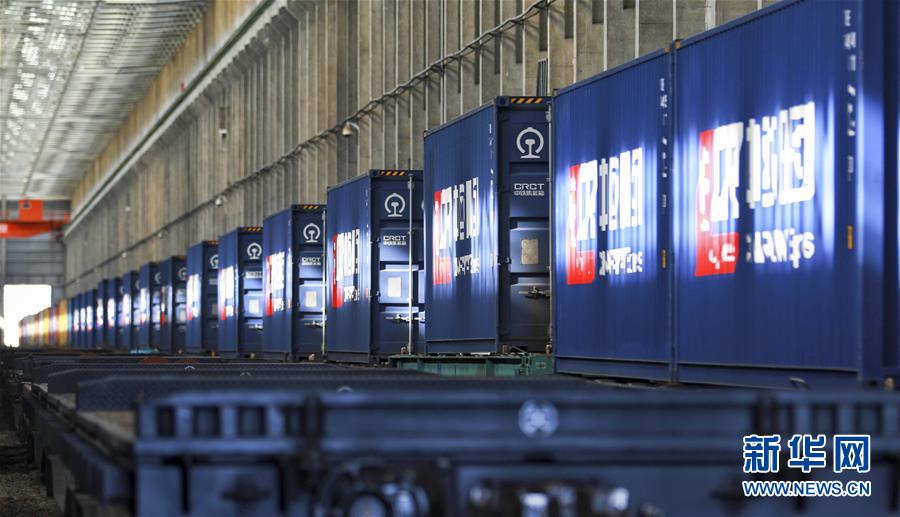 首趟中欧班列(伦敦-义乌)在阿拉山口口岸换装车库内进行集装箱换装。