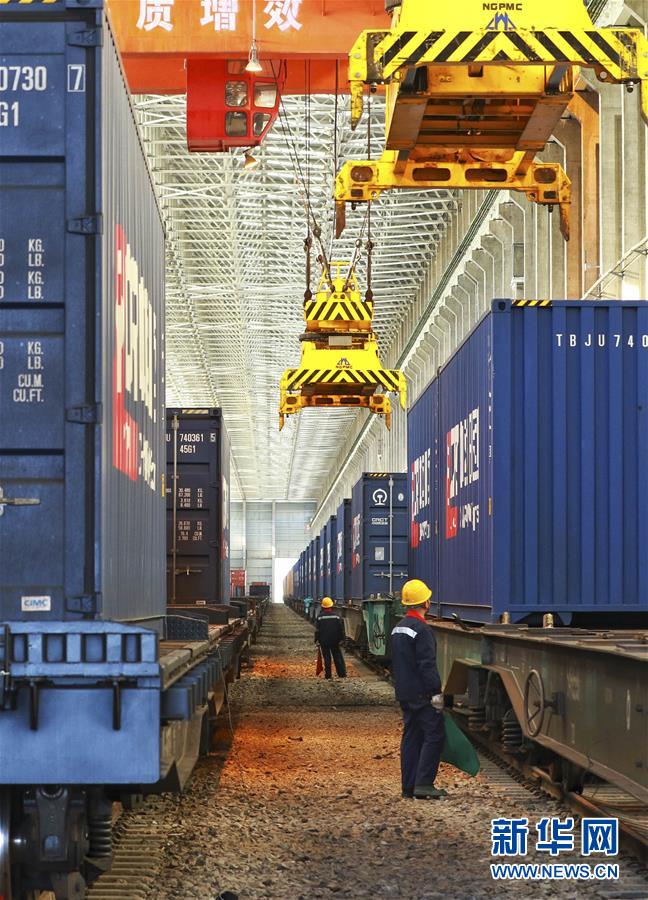 新闻提要 首趟中欧班列(伦敦-义乌)在阿拉山口口岸换装车库内进行集装箱换装。