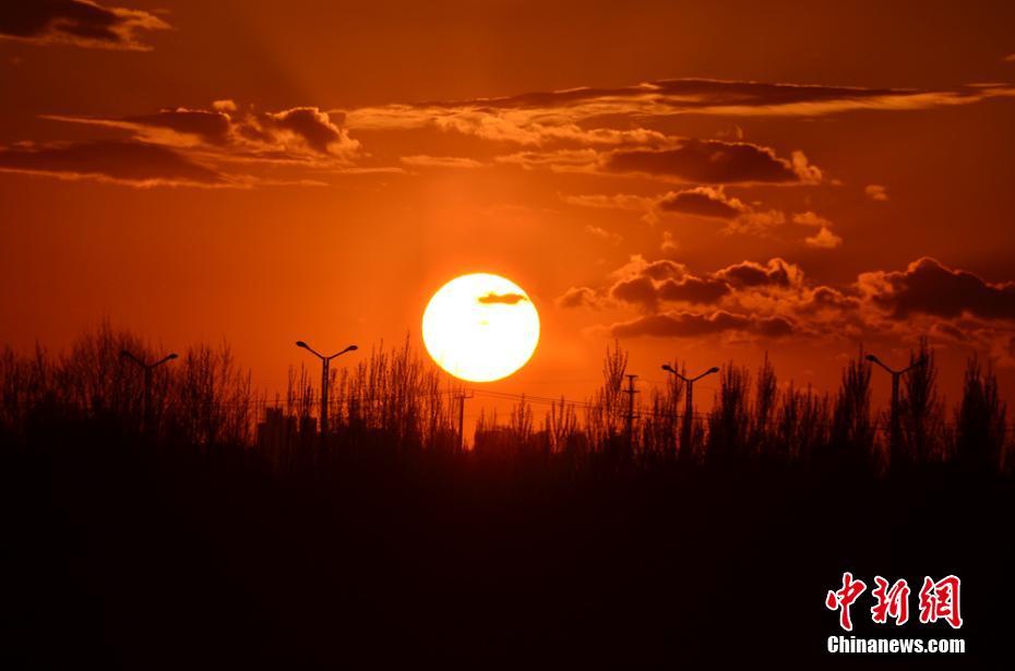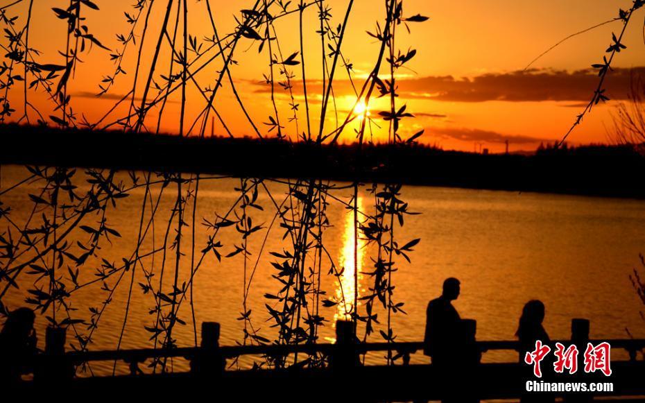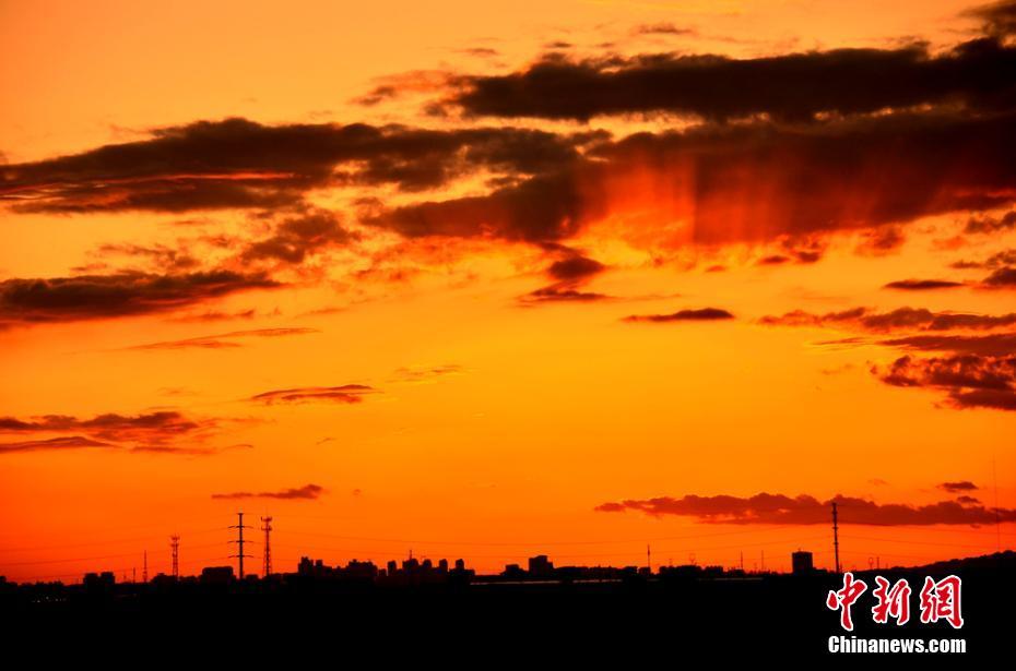 4月24日,甘肃酒泉市上空出现壮美“火烧云”盛景。当日下午,酒泉市市区突降大雨,雨后夕阳落山时,丝路公园上空的霞光和湖水里的倒影连成一片,格外美丽壮观。万宗平摄