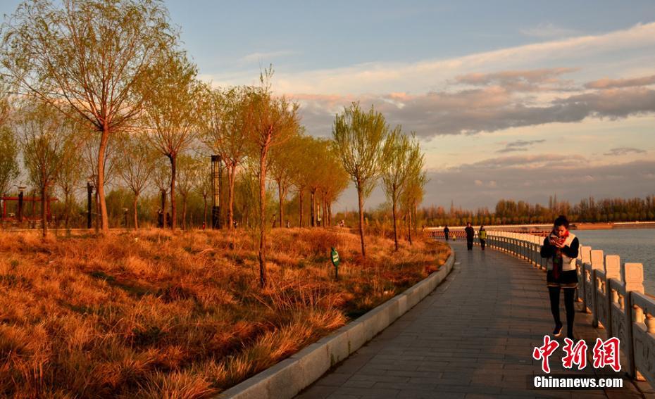 当日下午,酒泉市市区突降大雨,雨后夕阳落山时,丝路公园上空的霞光和湖水里的倒影连成一片,格外美丽壮观。