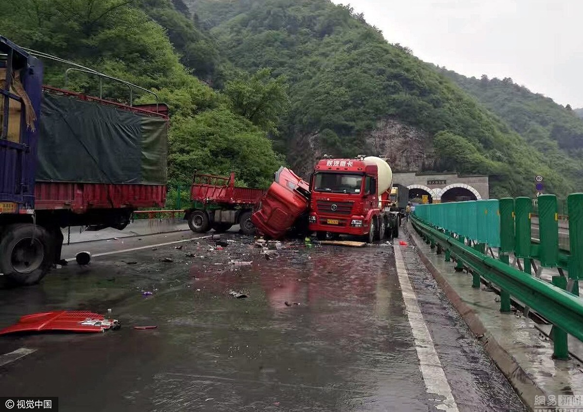 2017年4月25日消息,西安。4月25日早5时许,包茂高速西柞段西安方向发生9起追尾事故,近5公里的路段23辆车相撞,其中两辆货车追尾致1人死亡,另有4人受伤。图为事故现场。君风/视觉中国