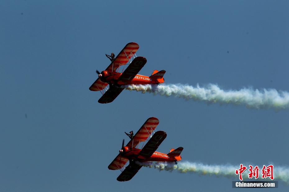 4月27日,2017郑州航展暨世界编队特技飞行年度颁奖盛典在郑州上街机场开幕。在特技飞行表演环节,特技飞机或编队飞行,或单闯晴空,在碧空中做出翻转内外筋斗、快速横滚、垂直跃升、高速俯冲、半筋斗翻转、半滚倒转、正倒螺旋等高难度动作,展现高超技能,极具观赏性。韩章云摄