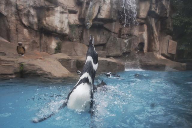 深圳野生动物园新引入的10只麦哲伦企鹅正式与游客见面,该园5只小长颈鹿也集体亮相。