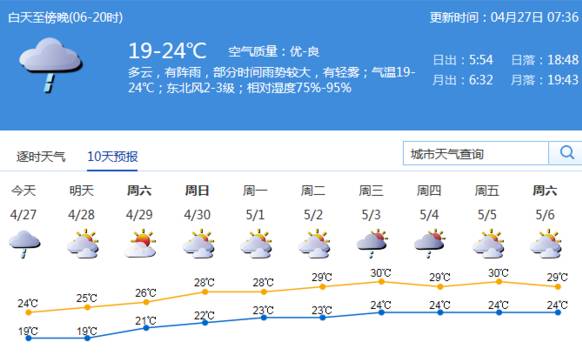 5月2日:多云,偶有分散阵雨,气温23-29℃