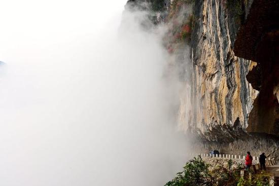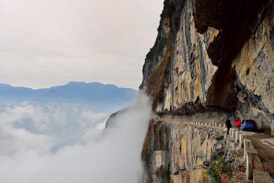 在重庆市开州区满月乡双坪村有一条特殊的农村公路——盘旋于海拔1500多米的高山,上方是岩石,外侧是绝壁深渊,云雾缭绕,险象环生,被称为“悬崖天路”。