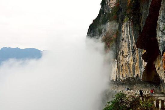 在重庆市开州区满月乡双坪村有一条特殊的农村公路——盘旋于海拔1500多米的高山,上方是岩石,外侧是绝壁深渊,云雾缭绕,险象环生,被称为“悬崖天路”。