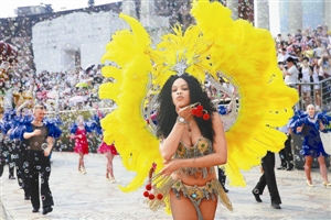 昨日,深圳世界之窗结合深圳文博会分会场活动,特推出深圳世界之窗南美文化风情节系列活动,景区专门从哥伦比亚、斐济、柬埔寨、南非等地邀请到当地著名舞蹈家加盟演出,为文博会献上一场瑰丽古典的南美文化盛宴。本届盛会,主要由南美狂欢嘉年华巡游、斐济太平洋岛国风情专场、柬埔寨东南亚风情专场、南非歌舞风情专场构成。图为世界之窗南美文化风情节系列活动表演。深圳商报记者 施平 通讯员 林志宏 摄