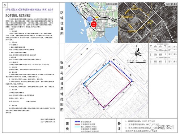 宝安区宝城38区新乐花园城市更新单元被列入《2016年深圳市城市更新单元计划第四批计划》,现该更新单元规划(草案)已经过宝安区城市更新工作委员会审议,根据《中华人民共和国城乡规划法》、《深圳市城市更新办法实施细则》、《深圳市宝安区城市更新暂行办法》以及《关于印发<城市更新单元规划审批操作规则>的通告》(深规土【2013】786号)的规定,现予以公开展示,公告如下: