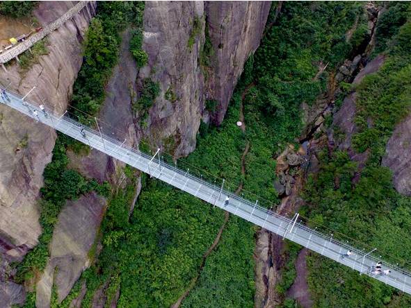 清远牛鱼嘴玻璃吊桥建于牛鱼嘴风景区的悬崖上,由铁索块巨透明玻璃搭建而成,于今年3月15日全线贯通。它全长250米,悬空桥身长达200米,离地高度超过200米,站在桥上仿佛悬浮于空中,“一不小心就会跌入深渊”的错觉给人惊吓,但桥下郁郁葱葱的丛林美景又让人惊叹不已。当然啦,担心自己恐高的小伙伴们还是要三思而后行啦~