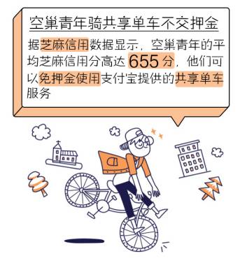 虽然消费能力不突出,但“空巢青年”普遍在信用评分上很争气。据芝麻信用数据显示,他们的平均芝麻信用分达到655分,是符合免押金使用共享单车的高信用群体。